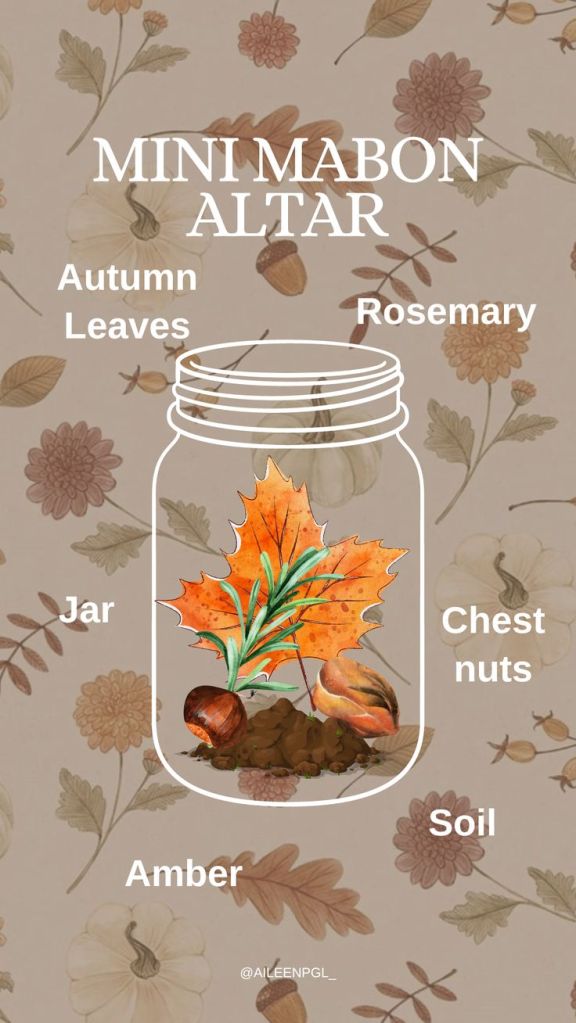 I came across this altar idea while searching on Mabon, but you could use it for any holiday. If you don’t have room for an entire altar, make a mini altar in a jar or box. If you’re in the broom closet, it’s easy to tuck away a mini altar, plus, they’re portable.